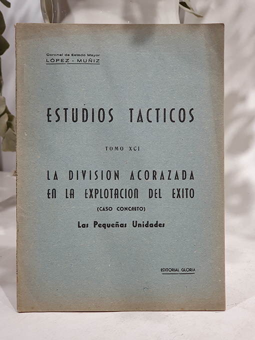 Publicado: Madrid: Editorial Gloria 1953 Autor: LÓPEZ MUÑIZ Título: Estudios Tácticos, Tomo XCI. La división acorazada en la explotación del éxito. Caso concreto: Las pequeñas unidades. Encuadernación: Rústica Estado: Muy bien Información adicional: 8vo. 52 pp. Rústica, perfecto estado.