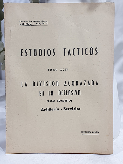 Publicado: Madrid: Editorial Gloria 1953 Autor: LÓPEZ MUÑIZ. Título: Estudios Tácticos, Tomo XCIV. La división acorazada en la defensiva. Caso concreto. Artillería - Servicios. Encuadernación: Rústica Estado: Muy bien Información adicional: 8vo. 64 pp. Rústica, perfecto estado.