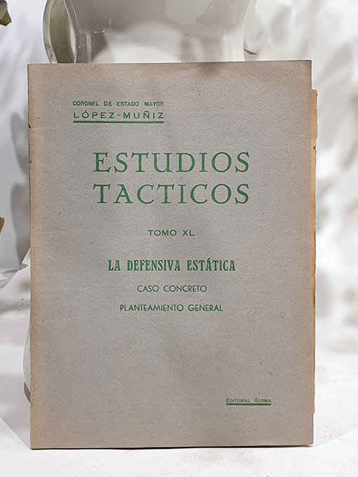 Publicado: Madrid: Editorial Gloria 1946 Autor: LÓPEZ MUÑIZ Título: Estudios Tácticos, Tomo XL. La defensiva estática. Caso concreto: Planteamiento General. Encuadernación: Rústica Estado: Muy bien Información adicional: 8vo. 72 pp. 1 ,mapa. Rústica, perfecto estado.