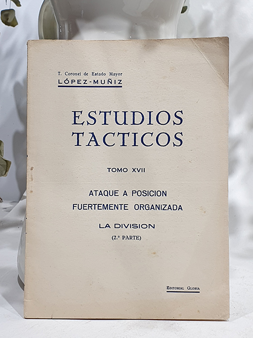 Publicado: Madrid: Editorial Gloria 1944 Autor: LÓPEZ MUÑIZ Título: Estudios Tácticos, Tomo XVII. Ataque a posición fuertemente organizada. La división. 2ª parte. Encuadernación: Rústica Estado: Muy bien Información adicional: 8vo. 88 pp. Rústica, perfecto estado.