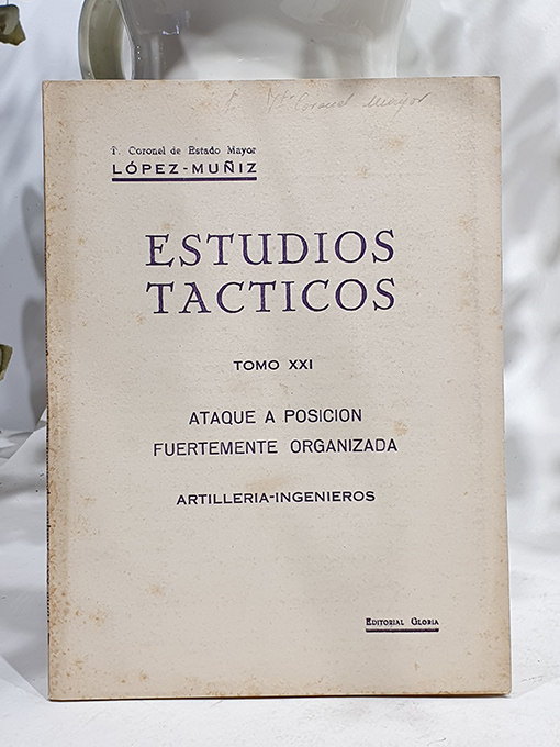 Publicado: Madrid: Editorial Gloria 1944 Autor: LÓPEZ MUÑIZ. Título: Estudios Tácticos, Tomo XXI. Ataque a posición fuertemente organizada. Artillería - Ingenieros. Encuadernación: Rústica Estado: Muy bien Información adicional: 8vo. 72 pp. + 1 estado plegado. Rústica, perfecto estado.