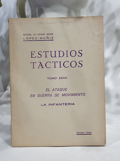 Publicado: Madrid: Editorial Gloria 1945 Autor: LÓPEZ MUÑIZ. Título: Estudios Tácticos, Tomo XXVII. El ataque en guerra de movimiento. La infantería. Encuadernación: Rústica Estado: Muy bien Información adicional: 8vo. 95 pp. Rústica en perfecto estado. .