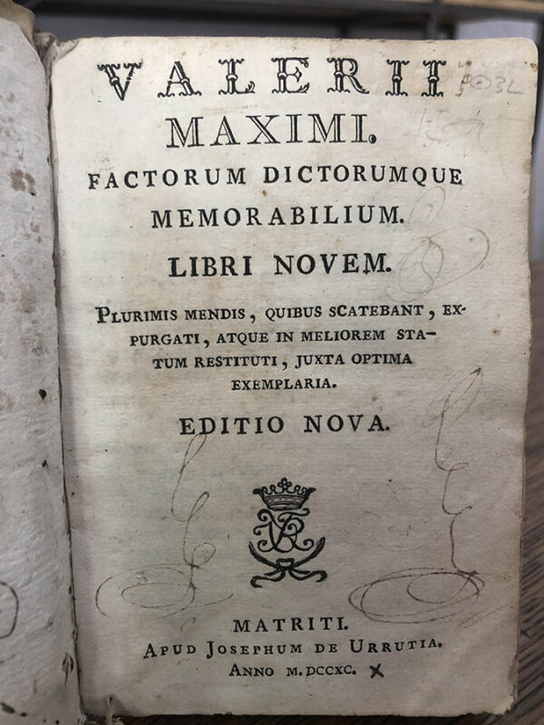 Publicado: Matriti: Apud Josephum de Urrutia, 1790 Autor: VALERII MAXIMI. Título: Factorum dictorumque memorabilium. Libri novem. Plurimis mendis, quibus scatebant, expurgati, atque in meliorem statum restituti, juxta optima exemplaria. Encuadernación: Encuadernación de tapa dura Estado: Pobre Información adicional: 8vo. 557 pp. Encuadernación pergamino de época. Ejemplar con el lomo y las tapas fatigadas aunque el interior se encuentra en buen estado, limpio y completo.
