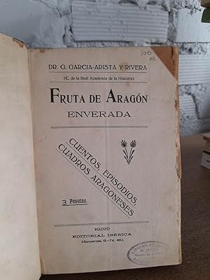 Publicado: Madrid: Editorial Ibérica, ca.1920 Autor: GARCÍA-ARISTA Y RIVERA, G. Título: Fruta de Aragón enverada. Cuentos, episodios, cuadros aragoneses. Encuadernación: Encuadernación de tapa dura Estado: Aceptable Información adicional: 8vo. 268 pp. + 1 h. Encuadernación holandesa tela/cartoné no editorial. Portada un poco deslucida.