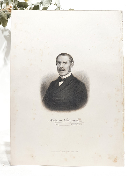 Publicado: Madrid: Montaner y Simón 1877 Título: [Grabado al acero] Modesto Lafuente. Retrato. Estado: Bien Información adicional: Folio, 24 x 33 cm. Buen estado. Perfecta para enmarcar.
