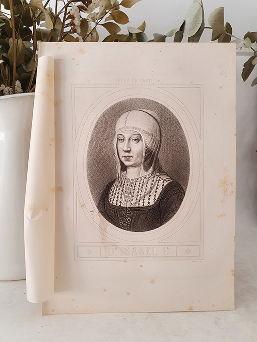 Título: [Grabado al acero] Retrato de Doña Isabel I. Encuadernación: Sin encuadernar Estado: Bien Información adicional: Folio, 33x24 cm. Buen estado. Perfecta para enmarcar.