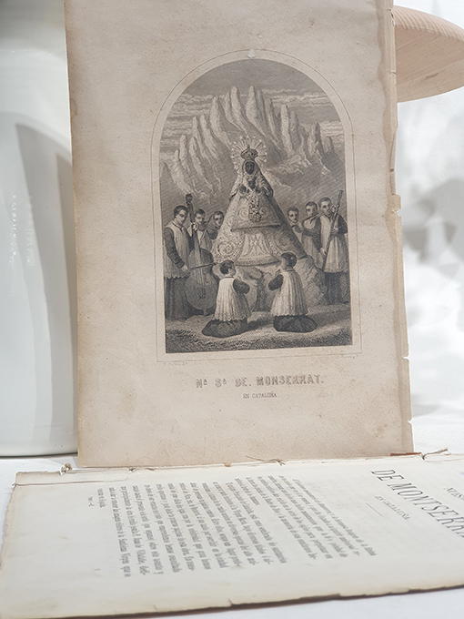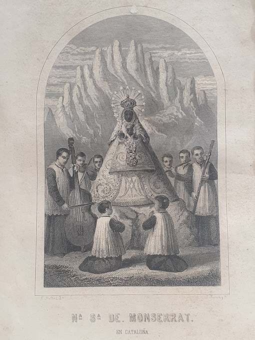 Título: [GRABADO] Nuestra Señora de Montserrat. Información adicional: 238 mm x 160 mm. Bonito grabado de la Virgen de Montserrat. Incluye 38 pp. con historia de la imágen, rezos, novenas...