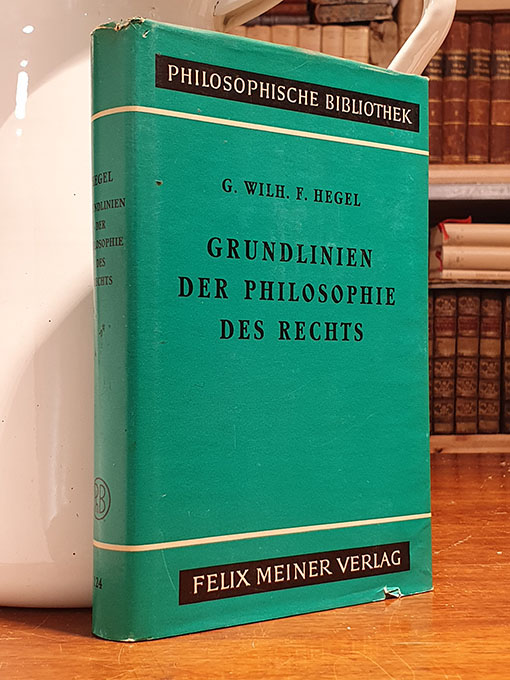 Publicado: Hamburg: Felix Meiner Verlag 1955 Autor: G. Wilh. F. Hegel Título: Grundlinien der Philosophie des Rechts (Philosophische Bibliothek Band 124) Encuadernación: Encuadernación de tapa dura Estado: Muy bien Información adicional: 8vo. 434 pp. Tela editorial con sobrecubierta. En perfecto estado. In original cloth binding with dust jacket. Very good condition, previous name owner and date (1958).
