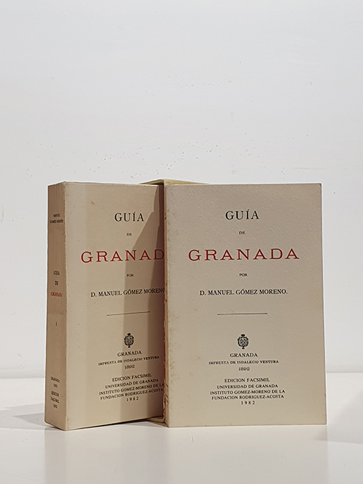 Publicado: Granada: Universidad de Granada 1982 Autor: GOMEZ MORENO, Manuel Título: Guía de Granada. Edición facsímil de la de Granaad, 1892 Encuadernación: Encuadernación de tapa blanda Estado: Como nuevo Información adicional: 16,5x11 cm. I: XI pp. + 530 pp.+ 1 h. + láminas y II: 330 pp. Rústica editorial con estuche, mínimas motitas de óxido en lomos.