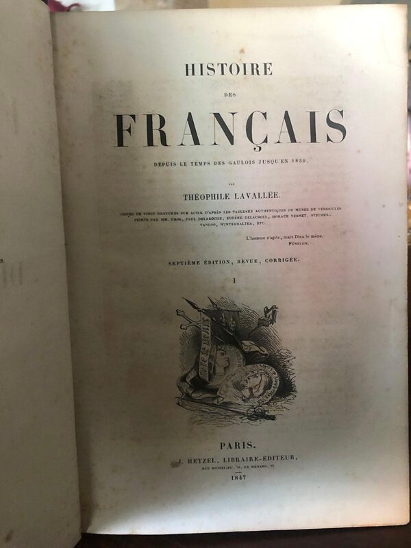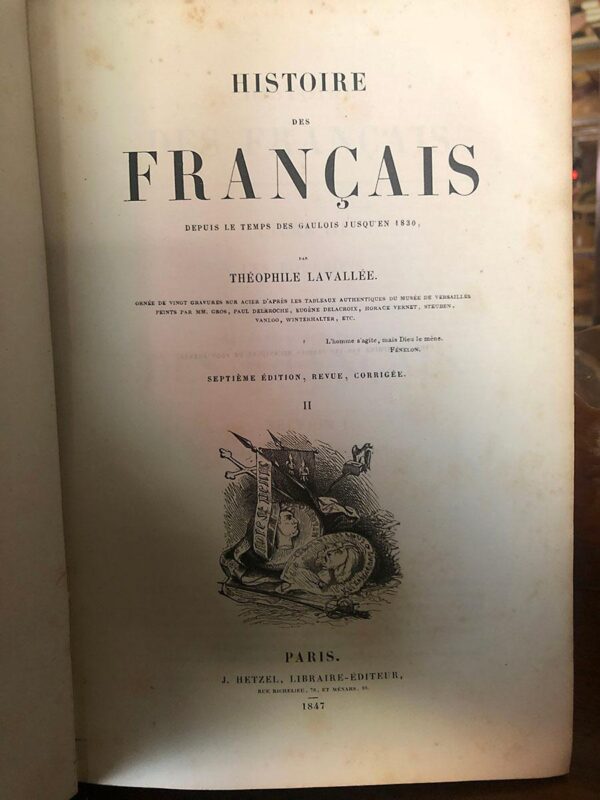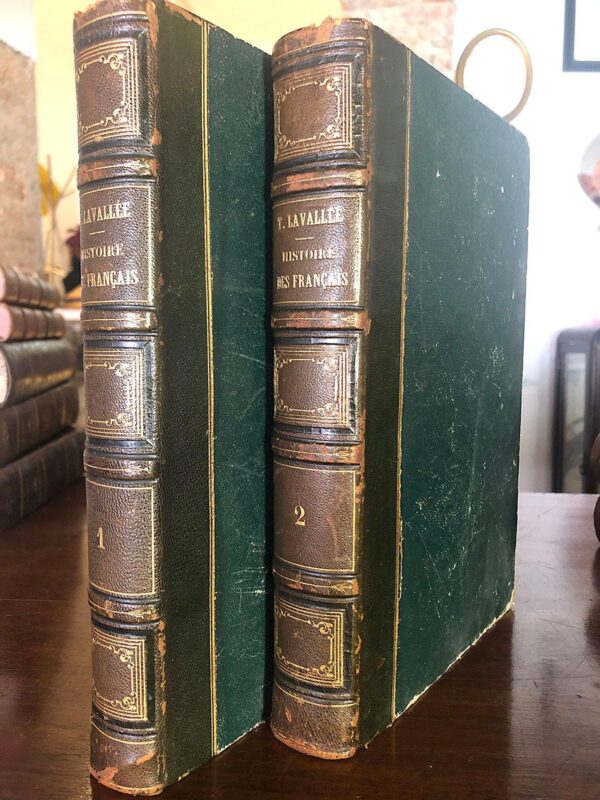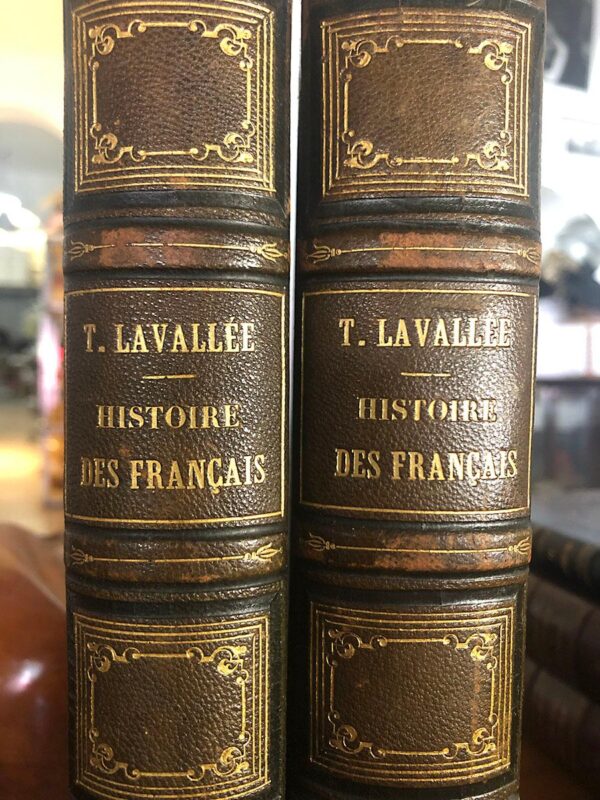 Publicado: París: Hetzel, 1847 Autor: LAVALLÉE, Théophile. Título: Histoire des Français. Depuis le temps des Gaulois jusqu´en 1830. 2 tomes. Encuadernación: Encuadernación de tapa dura Estado: Bien Información adicional: 4to. I: 654 pp. II: 740 pp. Holandesa de época con filetes dorados en lomo y nervios. Buen estado aunque carece de los grabados.