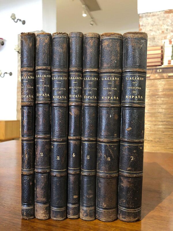Publicado: Madrid: Imp. Sociedad Literaria y Tipográfica, 1844-46. Autor: ALCALA GALIANO, Antonio. Título: Historia de España desde los tiempos primitivos hasta la mayoría de la Reina Doña Isabel II, redactado y anotado con arreglo a la que escribió en inglés el Doctor Dunham. Título completo: Con una reseña de los historiadores españoles de más nota por Don Juan Donos Cortés y un discurso sobre la historia de nuestra nación por Don Francisco Martínez de la Rosa. 7 Tomos. Encuadernación: Encuadernación de tapa blanda Estado: Muy bien Información adicional: 4to. I: - 266 pp. II: - 327 pp. ; III: - 346 pp, IV: - 281 pp; V: - 331 pp. VI: - 475 pp. VII: - 599 pp. Holandesa de época con nervios y hierros dorados en lomo. Ejemplar con poco óxido en algunos tomos y alguna que otra rozadura en el plano de la encuadernación pero en buen estado general. Palau 5735