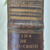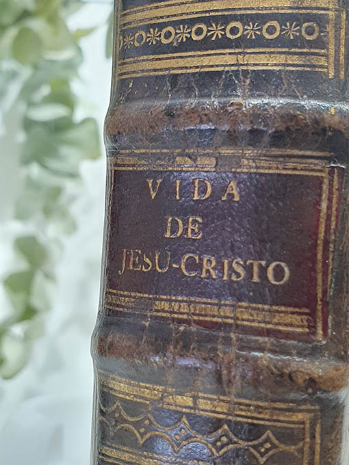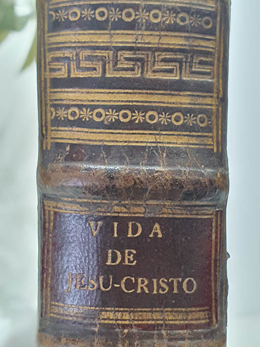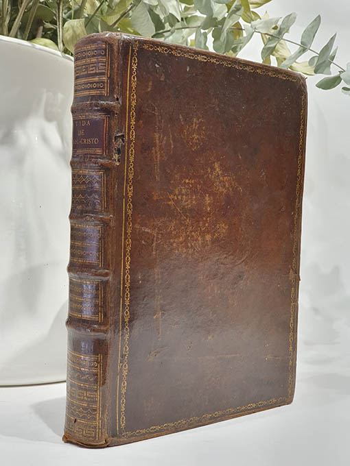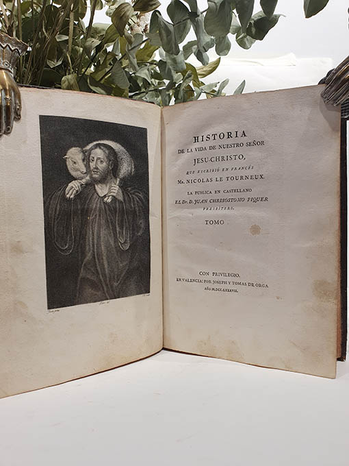 Publicado: Valencia: Jose y Tomas de Orga 1787 Autor: TOURNEUX, Nicolás Le. Título: Historia de la vida de Nuestro Señor Jesu-Christo,que escribió en francés.la publica en castellano el Dr. D. Juan Chrisostomo Piquer. [Jesucristo] Encuadernación: Encuadernación de tapa dura Estado: Muy bien Información adicional: 4to. 1 grabado calcográfico + 12 h. + LII pp. + 411 pp. Son dos tomos con paginación correlativa, nuestro ejemplar encuadernado bellamente en plena pasta española de época con nervios, 1 tejuelo y hierros dorados en lomo y planos delanteros de las tapa y cantos. Cortes tintados. Bien conservado, papel de excelente calidad y amplios márgenes. Presenta galería de xilófago en la parte exterior del cajo, según foto, que no llega al interior del ejemplar y algunas rozaduras en planos y puntas. Muy buen ejemplar.