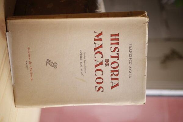 Publicado: Madrid: Revista ded Occidente, 1955 Autor: AYALA, Francisco. Título: Historia de macacos. Título completo: Con dos ilustraciones de Ricardo Zamorano. Información adicional: 8vo. 155 pp. + 2 láminas. Encuadernación editorial. Nombre ant. poseedor. Buen estado.