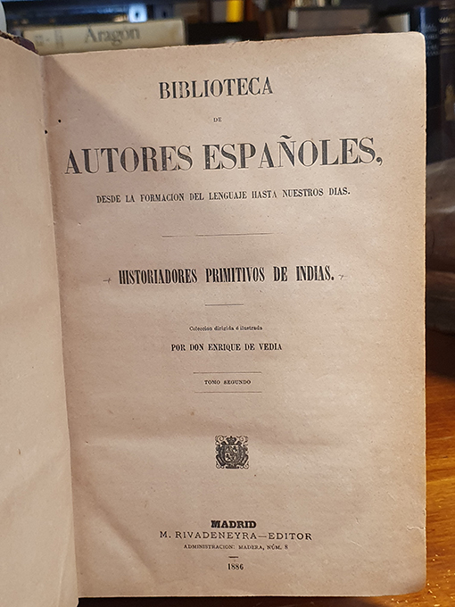Publicado: Madrid: M. Rivadeneyra 1886 Autor: VEDIA, Enrique de. Título: Historiadores primitivos de Indias. Tomo Segundo. Encuadernación: Encuadernación de tapa dura Estado: Aceptable Información adicional: 4to. XIVpp. + 574 pp. + 1 h. Holandesa de época. Ejemplar fatigado aunque completo y totalmente legible.