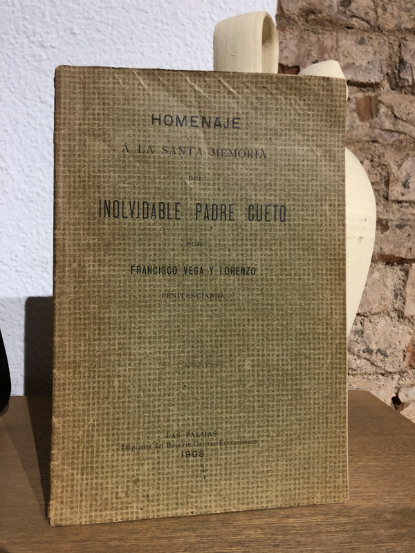 Publicado: Las Palmas: Imprenta del Boletín Oficial Eclesiástico, 1908 Autor: VEGA Y LORENZO, Francisco. Título: Homenaje a la santa memoria del involvidable Padre Cueto. Encuadernación: Rústica Estado: Bien Información adicional: 4to. 49 pp. + 1 h. Rústica en buen estado, con roturitas marginales aquí y allá pero legible, completo-