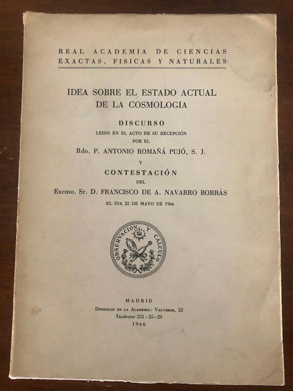 Publicado: Madrid: Real Academia de Ciencias Exactas, Físicas y Naturales, 1966 Autor: ROMAÑA PUJO, Antonio y Francisco de A. NAVARRO BORRAS. Título: Idea sobre el estado actual de la cosmología. Discurso leido en el acto de su recepción por el ... y Contestación por... Encuadernación: Encuadernación de tapa blanda Estado: Bien Información adicional: 4to. 243 pp. + 1h. Encuadernación editorial. Dedicatoria autógrafa del autor. Buen estado.