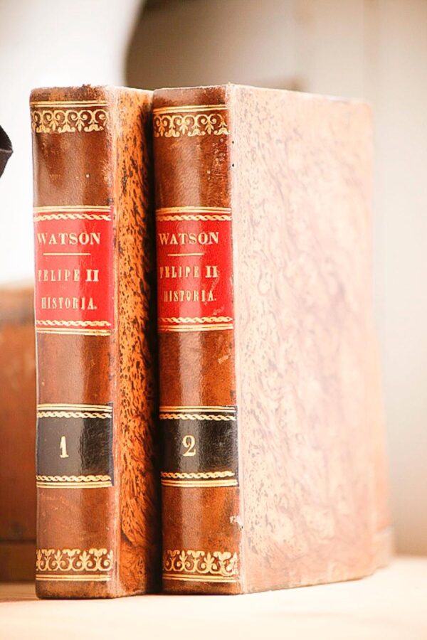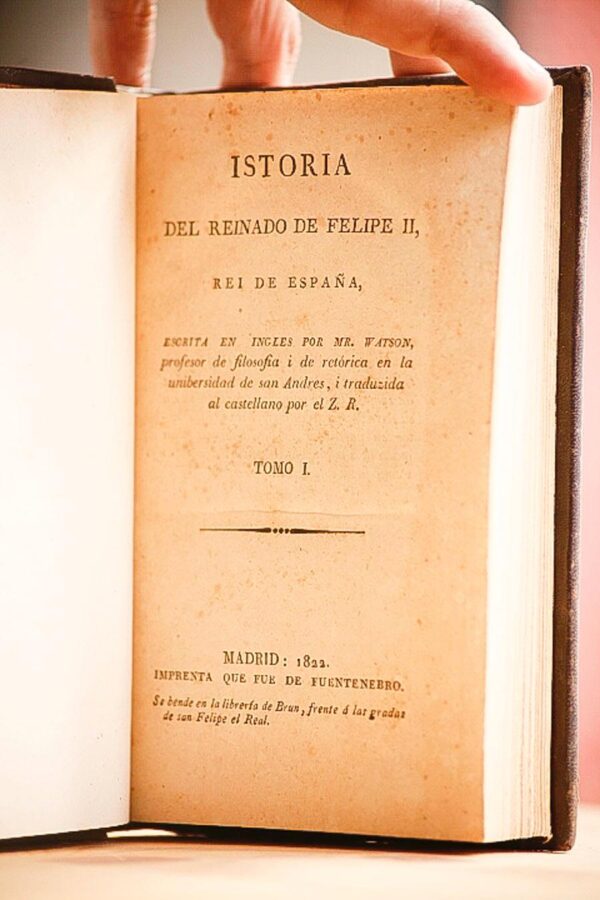 Publicado: Madrid: En la imprenta que fue de Fuentenebro, 1822 Autor: WATSON, Robert. Título: Istoria del reinado de Felipe II, Rei de España. Información adicional: Escrita en Inglés por Mr. Watson, profesor de filosofía i de retórica en la unibersidad (sic) de San Andrés y traduzida al castellano por Z. R. 8vo. I: XVIII pp. + 447 pp. II: 468 pp.Encuadernación en pasta española de época con doble tejuelo y hierros en lomo. Muy buen ejemplar.