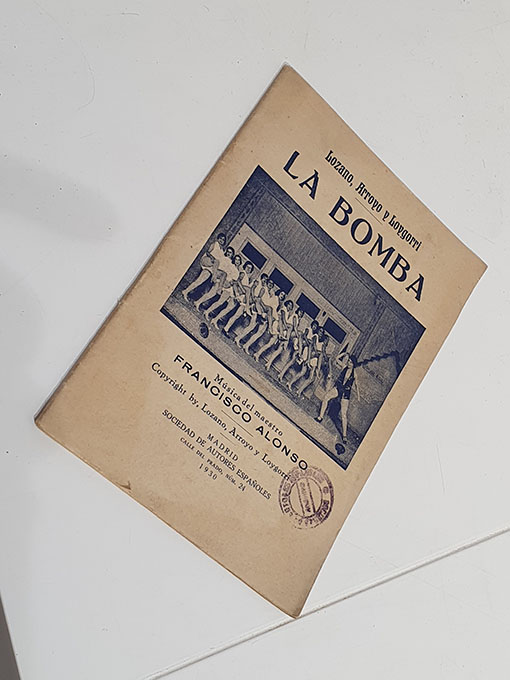 Publicado: Madrid: Sociedad de Autores Españoles 1930 Autor: Lozano, Arroyo y Loigorri. Título: La Bomba. Musica del Maestro Francisco Alonso. Encuadernación: Rústica Estado: Bien Información adicional: 8vo. 30 pp. Rústica con ilustración en cubierta, en perfecto estado. Edición de 300 ejemplares. Raro.