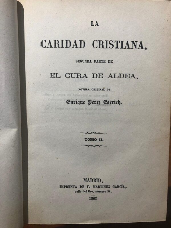 Publicado: Madrid: Imprenta de F. Martínez García, 1863 Autor: PÉREZ ESCRICH, Enrique. Título: La Caridad Cristiana. Segunda parte del Cura de la Aldea, novela original de... Tomo II. Encuadernación: Encuadernación de tapa dura Estado: Muy bien Información adicional: 8vo. 254 pp. Bonita encuadernación de época en holandesa con los cortes dorados, alguna rozadura menor. Interior impecable estado.