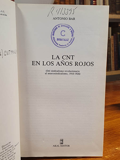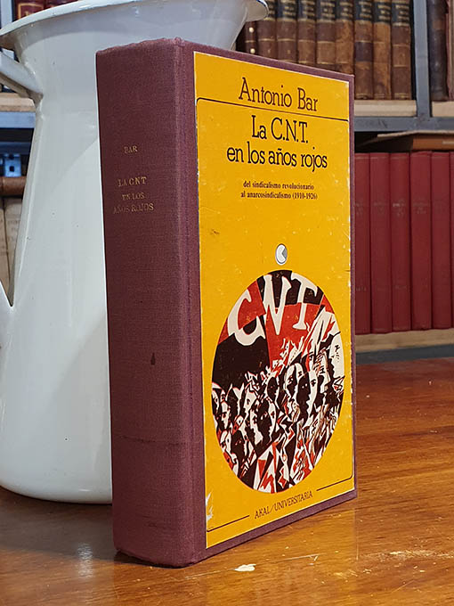 Publicado: Barcelona: AKAL 1981 Autor: BAR, Antonio. Título: La CNT en los años rojos. Del sindicalismo revolucionario al anarcosindicalismo (1910- 1926). ISBN: 2724209788 Encuadernación: Encuadernación de tapa dura Estado: Muy bien Información adicional: 4to. 831 pp. Encuadernación en tela no editorial con título en dorado en lomo y las cubiertas superpuestas en tapas. Sello caucho enajenación antigua biblioteca. En perfecto estado.