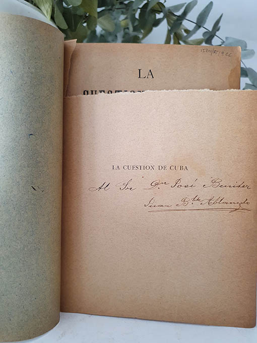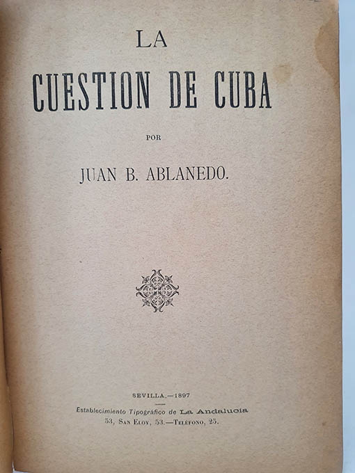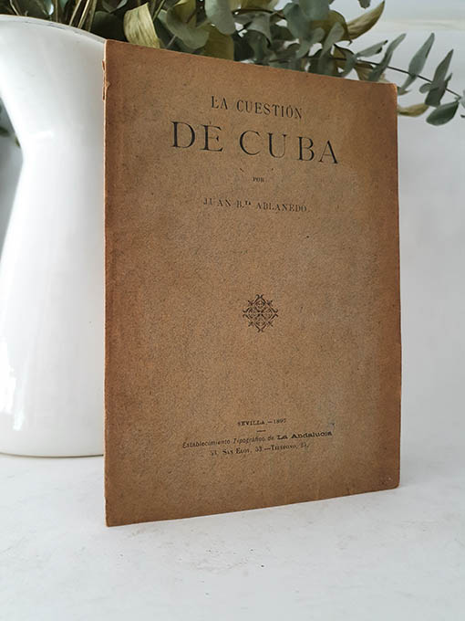 Publicado: Sevilla: Establecimiento Tipográfico de La Andalucía 1897 Autor: ABLANEDO, Juan B. Título: La cuestión de Cuba. Encuadernación: Rústica Estado: Bien Información adicional: 8vo. 65 pp. Rústica. Tirada de 250 ejemplars. Muy raro. Pérdida de 1/6 de la parte superior de la página de respeto, aunque conserva dedicatoria autógrafa el autor. El resto de ejemplar en magníficas condiciones de conservación.