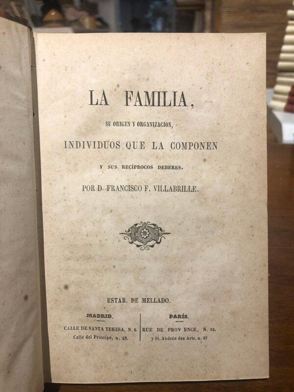Publicado: Madrid: Est. Mellado, ca. 1890 Autor: VILLABRILLE, Francisco. Título: La familia, su origen y organizacion. Individuos que la componen y sus recíprocos deberes. Encuadernación: Encuadernación de tapa dura Estado: Muy bien Información adicional: 8vo. 237 pp. + 1 h. Encuadernación holandesa de época. Muy buen estado.