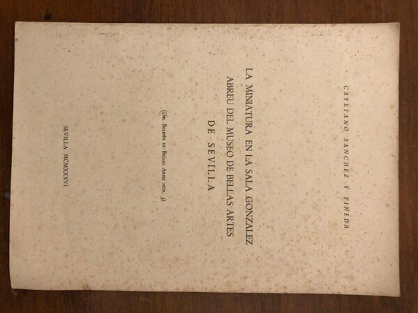 Publicado: Sevilla: Boletín de Bellas Artes, 1936 Autor: SÁNCHEZ Y PINEDA, Cayetano. Título: La miniatura en la sala González Abreu del Museo de Bellas Artes de Sevilla. Encuadernación: Rústica Estado: Aceptable Información adicional: 4to. 7 pp. + 2 lám. Rústica. Dedicatoria autógrafa del autor.