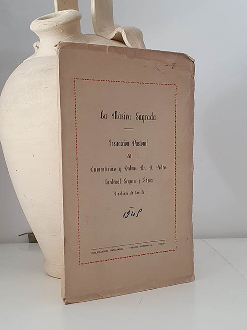 Publicado: Sevilla: Publicaciones Diocesanas 1945 Autor: CARDENAL SEGURA. Título: La Música Sagrada. Instrucción Pastoral del Eminentísimo y Rvdmo. Dr. D. Pedro Cardenal Segura y Sáenz. Encuadernación: Rústica Estado: Bien Información adicional: 8vo. 32 pp. Rústica. Páginas orladas en rojo. Papel poroso, oxidado, algo de fatiga.