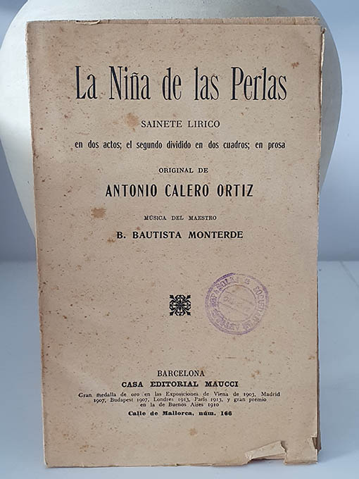 Publicado: Barcelona: Casa Editorial Maucci 1924 Autor: CALERO ORTIZ, Antonio. Título: La niña de las perlas. Sainete lírico en dos actos; el segundo dividido en dos cuadros; en prosa. Encuadernación: Rústica Estado: Bien Información adicional: 8vo. 63 pp. Rústica. Intonso.