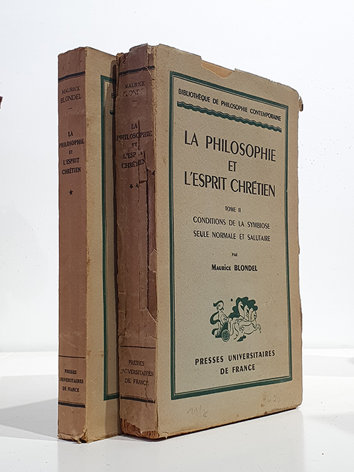 Publicado: Paris: Presses Universitaires de France, 1944-1946 1946 Autor: BLONDEL, Maurice. Título: La philosophie et l'esprit chrétien. Tome I : Autonomie essentielle et connexion indéclinable. Tome II : Conditions de la symbiose seule normale et salutaire. Coll. Bibliothèque de philosophie contemporaine. Encuadernación: Rústica Estado: Bien Información adicional: 2 vol. in-8° brochés, XVI-338 + XI-379 pp. Rústica, tomo I un poco fatigado.