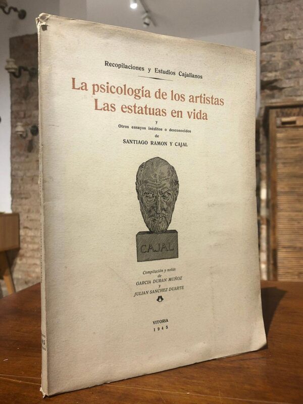 Publicado: Vitoria: Industrias Gráficas Ortega, 1945 Autor: RAMÓN Y CAJAL, Santiago. Título: La psicologia de los artistas, Las estatuas en vida y otros ensayos inéditos o desconocidos. Encuadernación: Encuadernación de tapa blanda Estado: Bien Información adicional: 25x18 cm. 199 p. + X lám. Rústica, Dedicatoria autógrafa del anterior poseedor en pág. de respeto. Buen estado.
