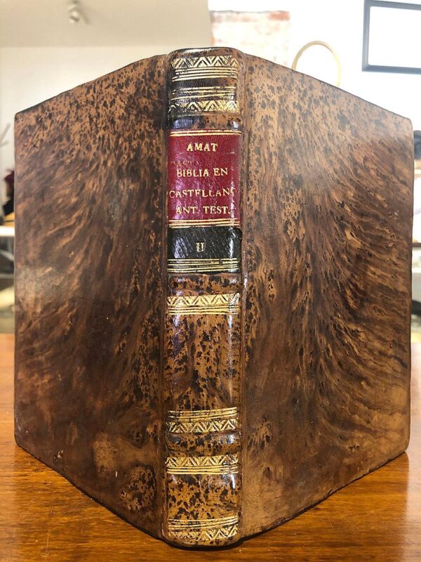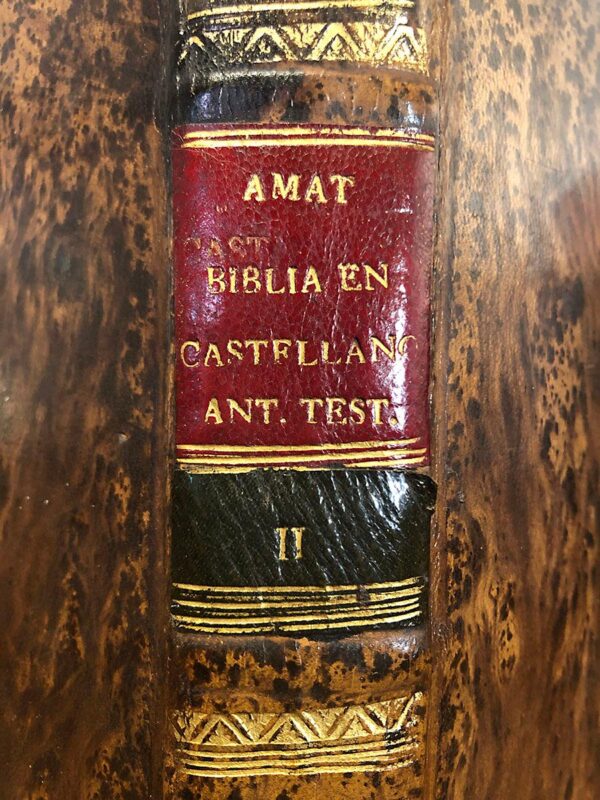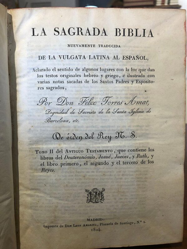 Publicado: Madrid: Imprenta de León de Amarita, 1824 Título: La Sagrada Biblia nuevamente traducida de la Vulgata Latina al español. Por D. Felix Torres Amat. TOMO II del Antiguo Testamento. Que contiene los Libros del Deuteronómio, Josué, Jueces, y Ruth. Y el libro primero, segundo y tercero de los Reyes. Encuadernación: Encuadernación de tapa dura Estado: Muy bien Información adicional: 4to. Portada + 502 pp. Encuadernación plena pasta española de época con tejuelo y filetes dorados en lomo. Cortes tintados. Perfecto estado.
