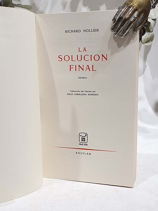 Publicado: Madrid: Aguilar 1938 Autor: NOLLIER, R. Título: La solución final. Encuadernación: Rústica Estado: Bien Información adicional: 8vo. 380 pp. Encuadernción rústica, en muy buen estado.