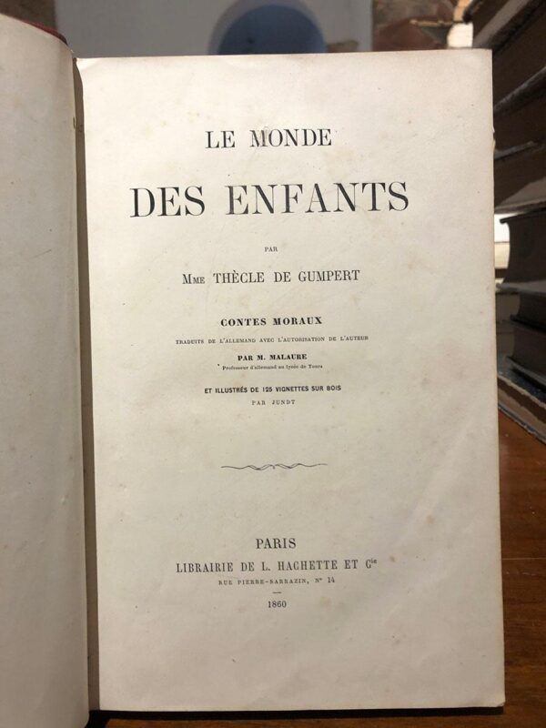 Publicado: París: Librairie de L. Hachette, 1860 Autor: THECLE DE GUMPERT, (Mme) Título: Le monde des enfants. Contes moraux. Illustrés de 125 vignettes sur boix par Jundt. Encuadernación: Encuadernación de tapa dura Estado: Aceptable Información adicional: 4to. 345 pp. + 1 h. Holandesa de época con dorados en el lomo. En francés