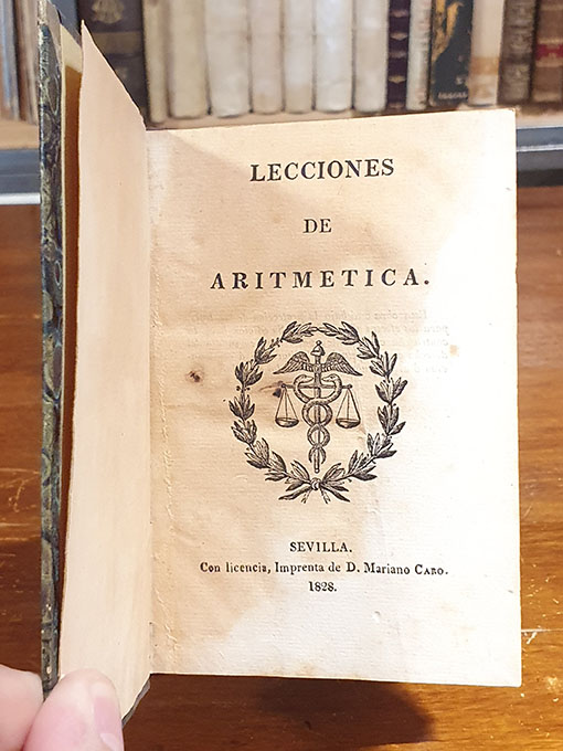 Publicado: Sevilla: Imprenta de D. Mariano Caro, 1828 Autor: HERRERA Y ÁVILA, J. / A. ALVEAR. Título: Lecciones de aritmética. Estado: Aceptable Información adicional: 8vo. 187 pp. + 2 h. Holandesa de época con título y hierros dorados en lomo. Portada y primeras 15 páginas con mancha según fotos.