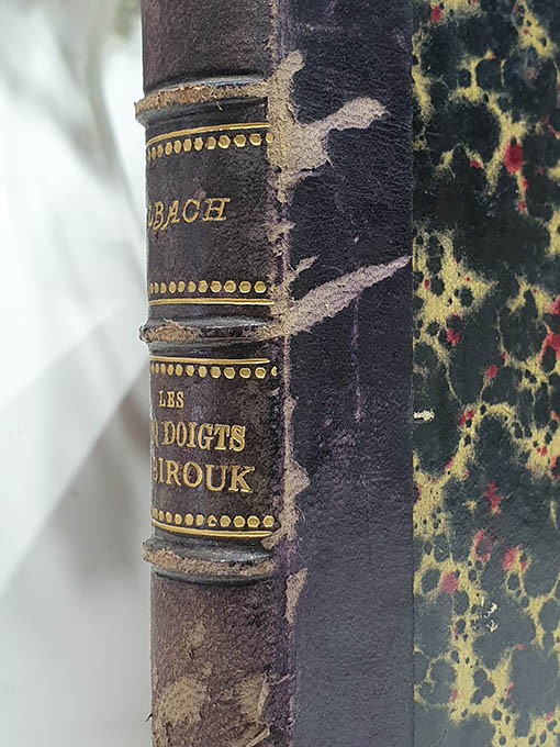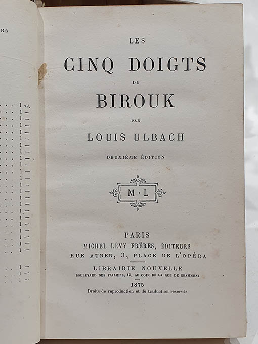 Publicado: Paris: Michel Lévy Frères Editieurs 1875 Autor: ULBACH, Louis. Título: Les cinq doigts de Birouk. Encuadernación: Encuadernación de tapa dura Estado: Bien Información adicional: 8vo. 371 pp. Encuadernación en media piel con nervios. Alguna rozadura en lomo pero ejemplar limpio y con buen papel.