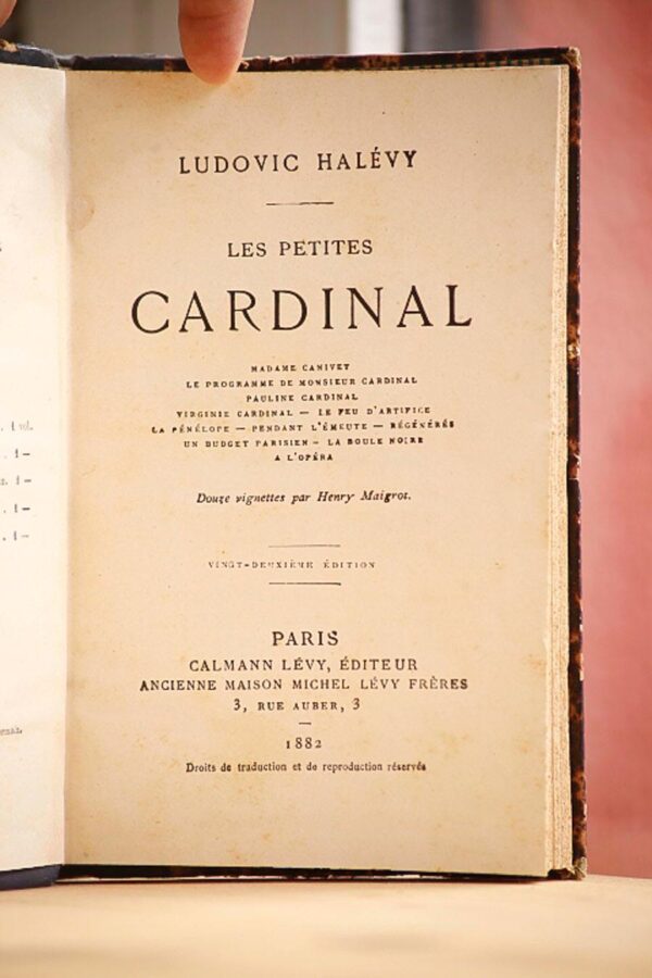 Publicado: Paris: Calmann Lévy, 1889 Autor: Pauline. HALEVY, Título: Les petites Cardinal. Madame Canivet.- Le programme de Monsieur Cardinal.- Pauline cardinal.- Virginie Cardinal.- Le feu d'artifice. Encuadernación: Encuadernación de tapa dura Estado: Bien Información adicional: 8vo. 2 h. + 256 pp. + 1 h. Encuadernación holandesa de época. Buen estado. Ilustrado con diez viñetas del artista Henry Maigrot. Buen estado.