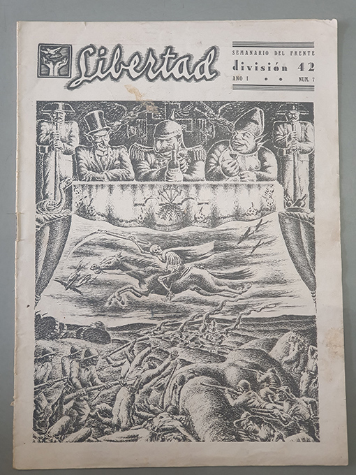 Publicado: Imprenta del Comité de Defensa 1937 Título: Libertad. Semanario del Frente. División 42. Año I. Núm. 7. Encuadernación: Rústica Estado: Aceptable Información adicional: Folio, 16 pp. Grapado. En aceptable estado. Numerosas reproducciones de xilografías cuya autoría ingnoramos. La revista publicó 7 números constituyendo el ofertado el último en publicarse.