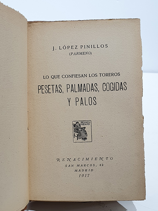 Publicado: Madrid: Renacimiento 1917 Autor: LÓPEZ PINILLOS, José. [Parmeno] Título: Lo que confiesan los toreros. Encuadernación: Encuadernación de tapa dura Estado: Nuevo Información adicional: 8vo. 241 pp. Plena piel. Lomo buen estado, lomo mudo.