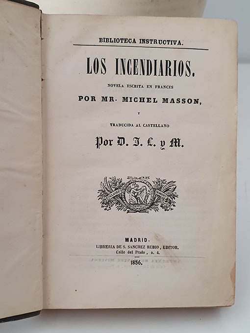 Publicado: Madrid: Librería de S. Sánchez Rubio Editor 1856 Autor: MASSON, Michel [Michel Benôit Gaudichot, 1800-1883]. Título: Los Incendiarios. Novela traducida al castellano por Don J. L. y M. [¿José Lesen y Moreno?]. Encuadernación: Encuadernación de tapa dura Información adicional: 8vo. 484 pp. + 2 h. + 6 láminas dibujadas y litografiadas por Urrabieta Holandesa. Un poco fatigado.