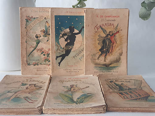 Publicado: Barcelona: López editor, ca. 1900 Autor: CAMPOAMOR, Ramón de. Título: [LOTE] Colección Diamante, tomos: Poesías y Fábulas (Primera Serie); Poesías y Fábulas (Primera y seegunda Serie); El Licenciado Torralba; Colón, poema; Pequeños poemas (Segunda serie); Pequeños Poemas, (Tercera serie) Encuadernación: Rústica Estado: Aceptable Información adicional: 16vo. Varias paginaciones. Todos los tomos en rústica y en aceptable estado, con algunas rozaduras en lomo y algo de óxido en cubiertas.