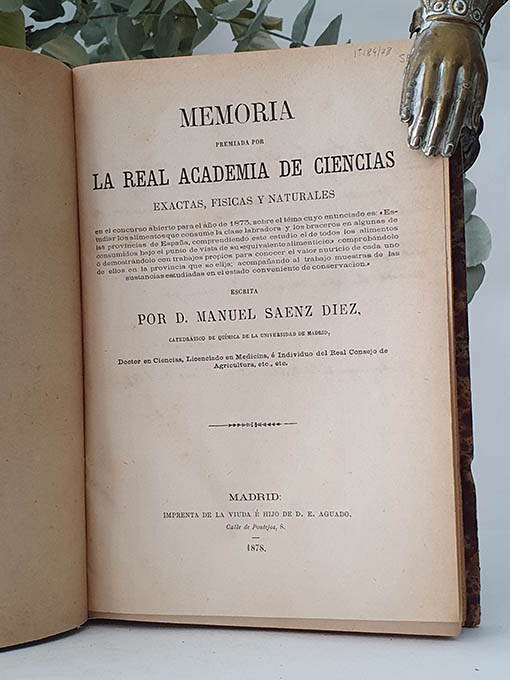Publicado: Madrid: Imprenta de la Viuda e Hijo de E. Aguado 1878 Autor: SAENZ DÍEZ, Manuel. Título: Memoria premiada por la Real Academia de Ciencias Exactas, Físicas y Naturales en el concurso abierto para el año de 1873. [Estudiar los alimentos que consume la clase labradora y los braceros en algunas de las provincias de España...] Encuadernación: Encuadernación de tapa dura Estado: Muy bien Información adicional: 4to. 317 pp. Holandesa de época con nervios, un poco rozada pero recia y firme. Buen estado.