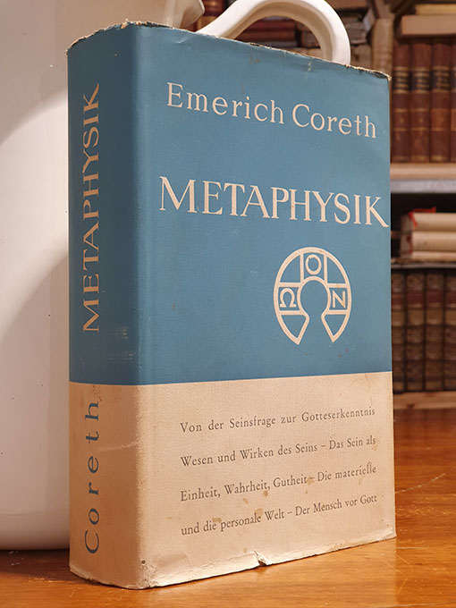 Publicado: Insbruck - Wien - München: Tyrolia Verlag 1961 Autor: CORETH, Emerich. Título: Metaphysic. Eine methodisch - systematische grundlegung. Encuadernación: Encuadernación de tapa dura Estado: Bien Información adicional: 8vo. 672 pp. In original cloth binding with dust jacket. Minor soiling but still good condition.