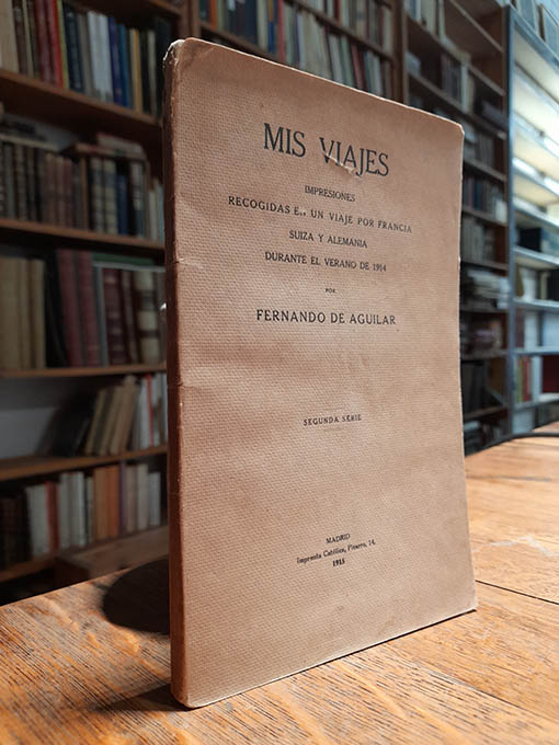 Publicado: Madrid: Imprenta Católica Pizarro, 1915 Autor: AGUILAR, Fernando. Título: Mis viajes. Impesiones recogidas en un viaje por Francia, Suiza y Alemania durante el verano de 1914. Segunda serie. Encuadernación: Rústica Estado: Bien Información adicional: 8vo. 104 pp. Encuadernación ediorial. Dedicatoria autógrafa del autor. Buen estado. Palau 3539.