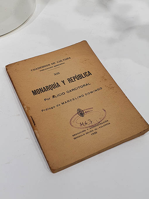Publicado: Valencia: Cuadernos de Cultura 1930 Autor: GARCITORAL, Alicio. Título: Monarquía y República Encuadernación: Rústica Estado: Pobre Información adicional: 8vo. 70 pp. Rústica. Falto de cubierta delantera pero completo y en buen estado el resto.