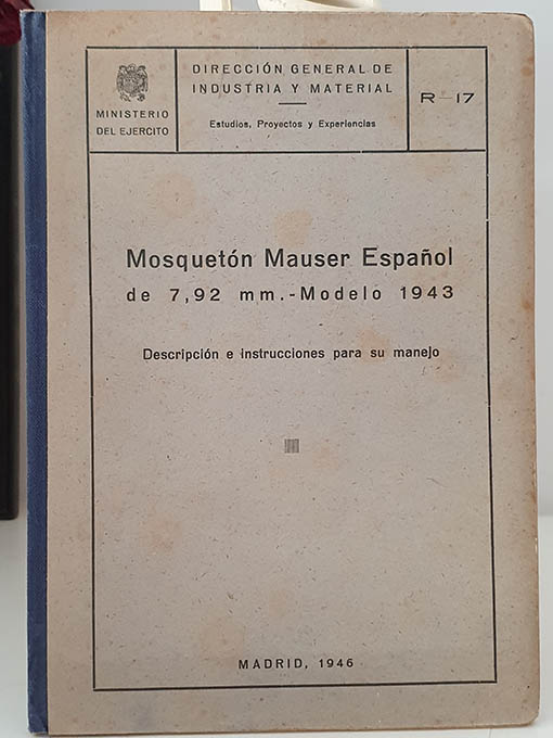 Publicado: Madrid: Dirección General de Industria y Material / Ministerio del Ejército 1943 Título: MOSQUETÓN MAUSER ESPAÑOL DE 7, 92 MM. - MODELO 1943. Descripción e instrucciones para su manejo. Estado: Muy bien Información adicional: 4to. 53 pp. + 6 láminas plegadas. Cartoné editorial en muy buen estado. Dirección General de Industria y Material - Estudios, Proyectos, Experiencias.