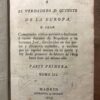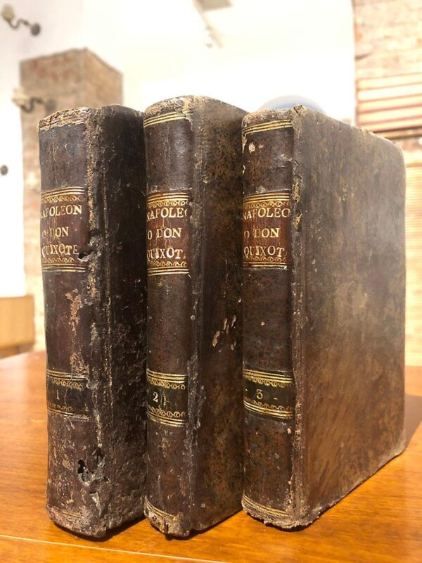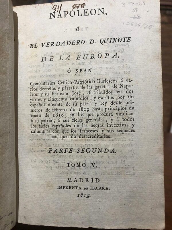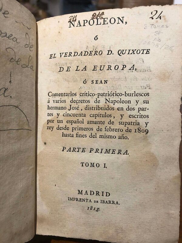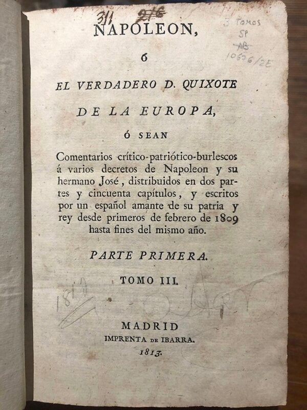 Publicado: Madrid: Imprenta de Ibarra, 1913 Título: Napoleón o el verdadero D. Quixote de la Europa. 6 tomos en 3 vol. Información adicional: 12vo. I: XXII pp. + 151 pp. II:240 pp. III: 163 pp. IV: 104 pp. 178 pp VI: 182 pp. (Cada volumen contiene 2 tomos) Encuadernación en plena pasta española de época. Tomo I con algo de fatiga, pero en general bien. Obra anónima de carácter satírico anti-napoleónico. A diferencia de la percepción que desde mediados del Siglo XIX se tiende a tener del personaje del Quijote, como identificador del carácter español, en el S. XVIII y principios de siglo XIX, este se relaciona con los aspectos más negativos de lo literario, lo filosófico o lo religioso.
