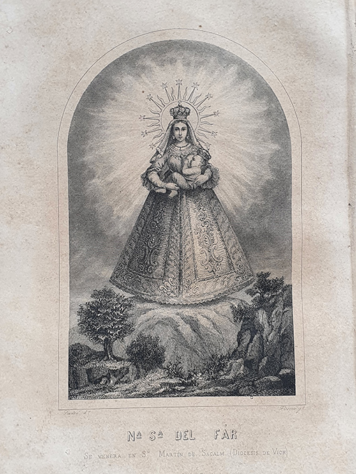 Título: Nuestra Señora del Far. San Martín de Sacalm Vich. Verge. Virgen. Finales s. XIX. Grabado- Información adicional: Finales s. XIX. 238 mm x 160 mm. Incluye 4 páginas con historia de la imagen. Papel amarillento. Ignoramos obra a la que perteneció pues llego a nuestras manos en una carpeta en el estado actual.