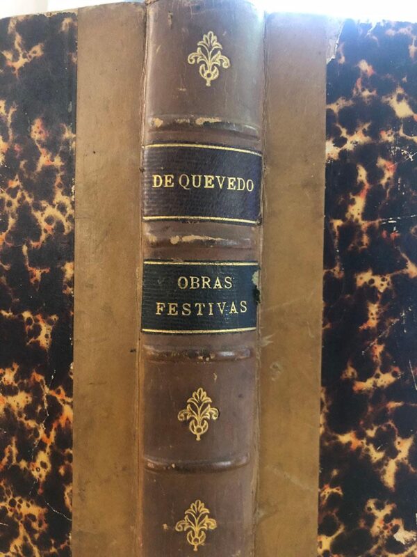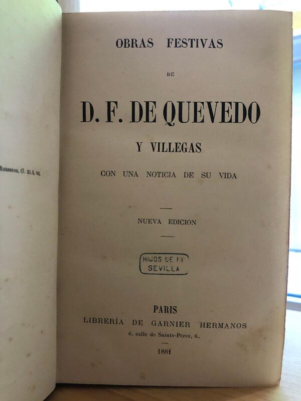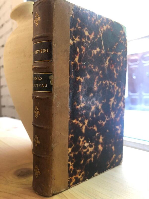 Publicado: París: Librería de Garnier Hnos., 1881 Autor: QUEVEDO Y VILLEGAS, Francisco de. Título: Obras festivas. Con una noticia de su vida. Encuadernación: Encuadernación de tapa dura Estado: Bien Información adicional: 8vo. VIII pp. + 504 pp. Encuadernación holandesa de época con nervios. Cortes tintados a juego con las guardas. Cantos de las tapas con rozaduras y algo de óxido pero en general en buen estado. Bonita edición que tiene una portadilla para cada uno de los capítulos que componen el libro.