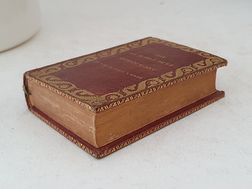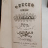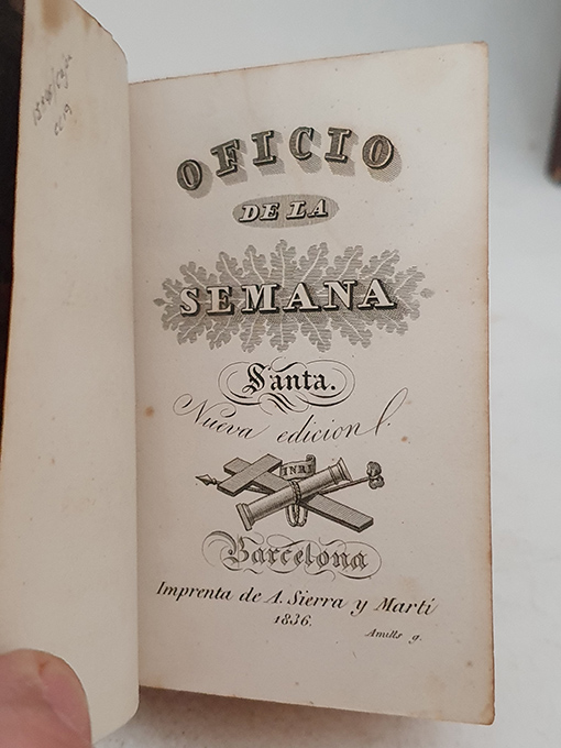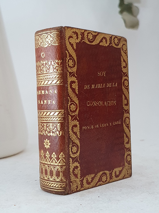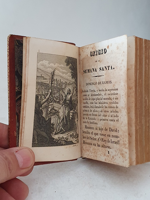 Publicado: Barcelona: Imprenta de A. Sierra y Martí 1836 Autor: J. L. V. P. Título: Oficio de la Semana Santa. Nueva edición. Encuadernación: Encuadernación de tapa dura Estado: Bien Información adicional: 16vo. 336 pp. + 3 grabados. Plena piel de época con ruedas doradas en lomo, planos y cantos y contracantos. Cortes dorados. Algo de óxido.